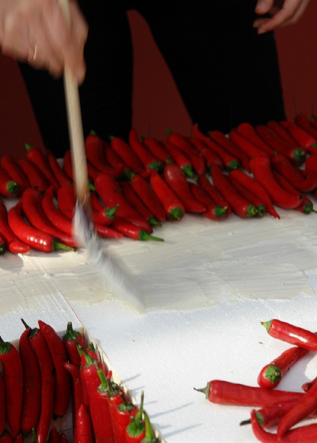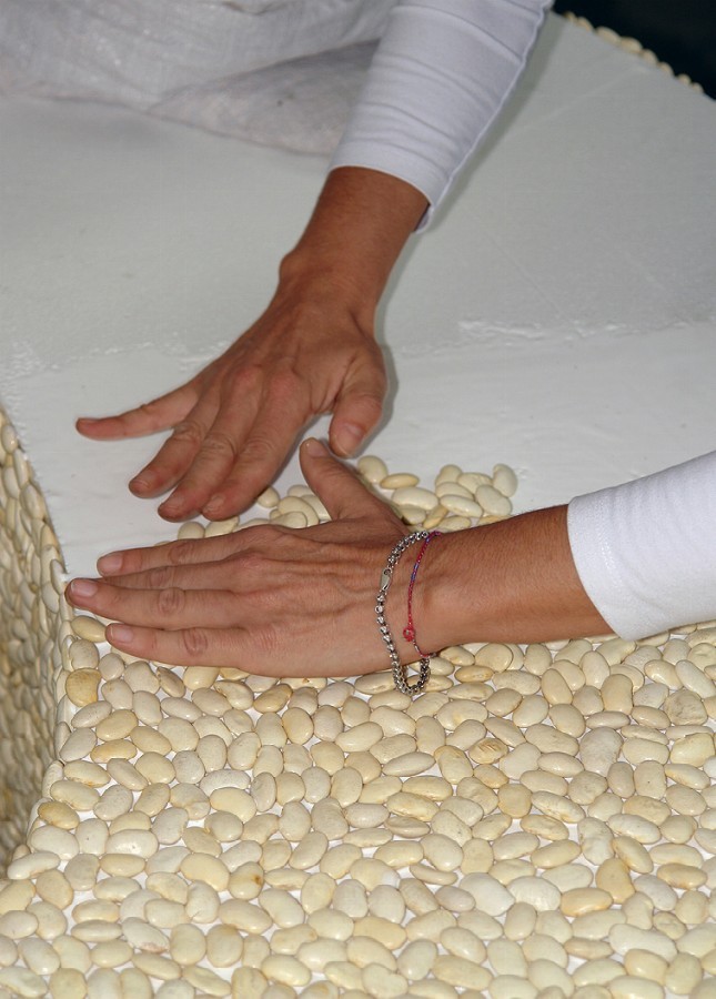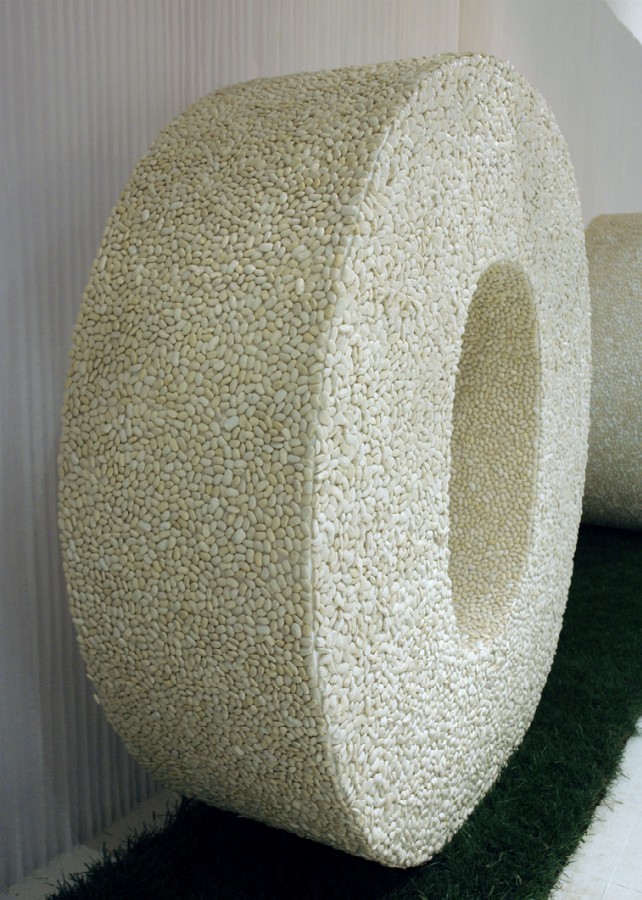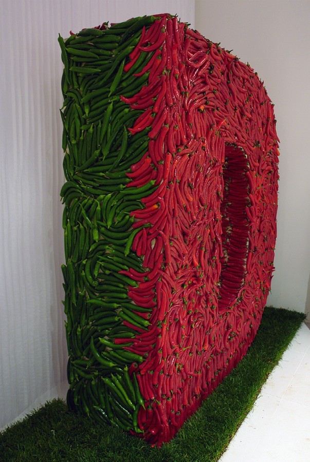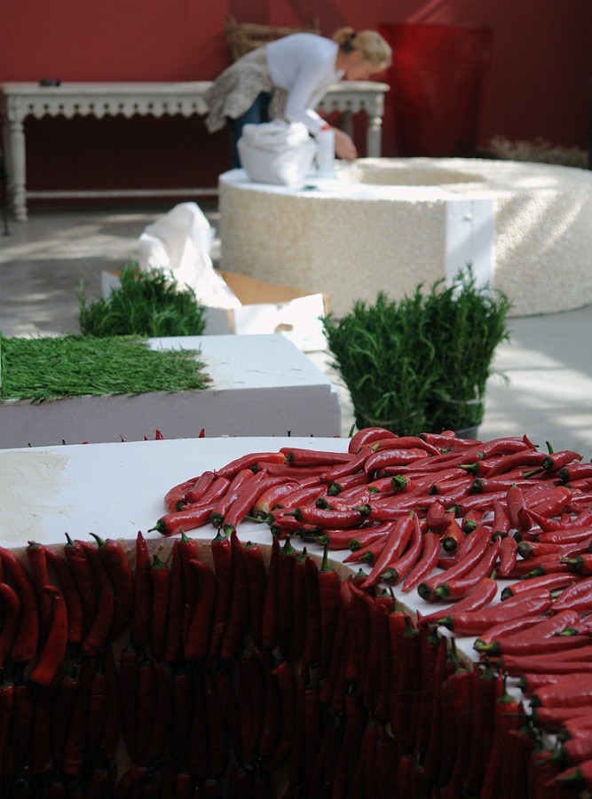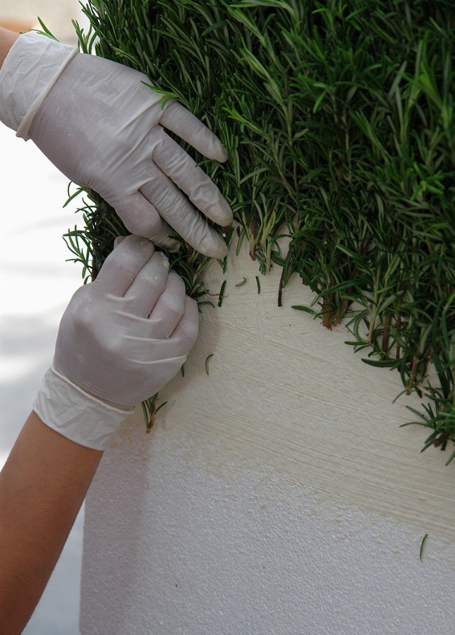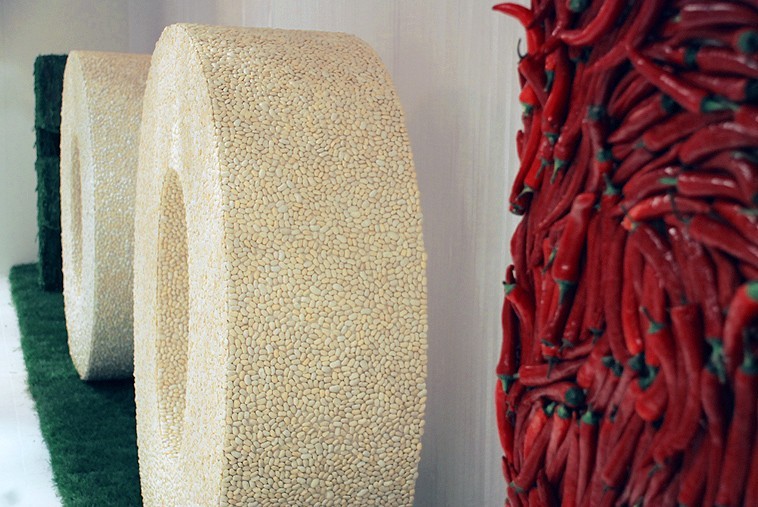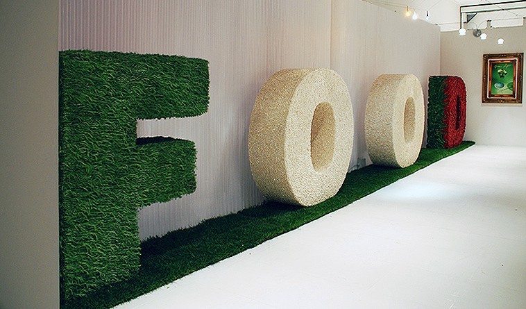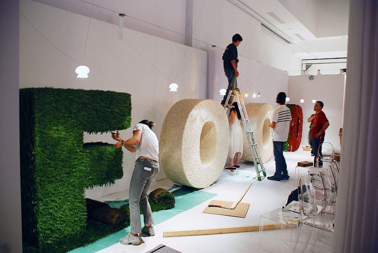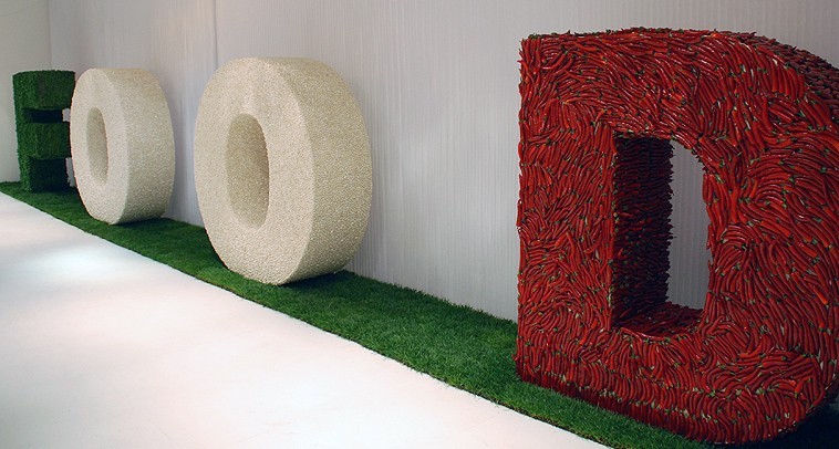 A three-dimensional tricolour, with letters one meter and seventy high, in fresh rosemary, white beans and spicy red chilli pepper, composed to trace the word FOOD: it is the installation, stage element and backdrop of the tastings offered by the Department of Agriculture of the Lombardy Region to the guests of Food Design Experience (Triennale of Milan, Salone del Mobile).