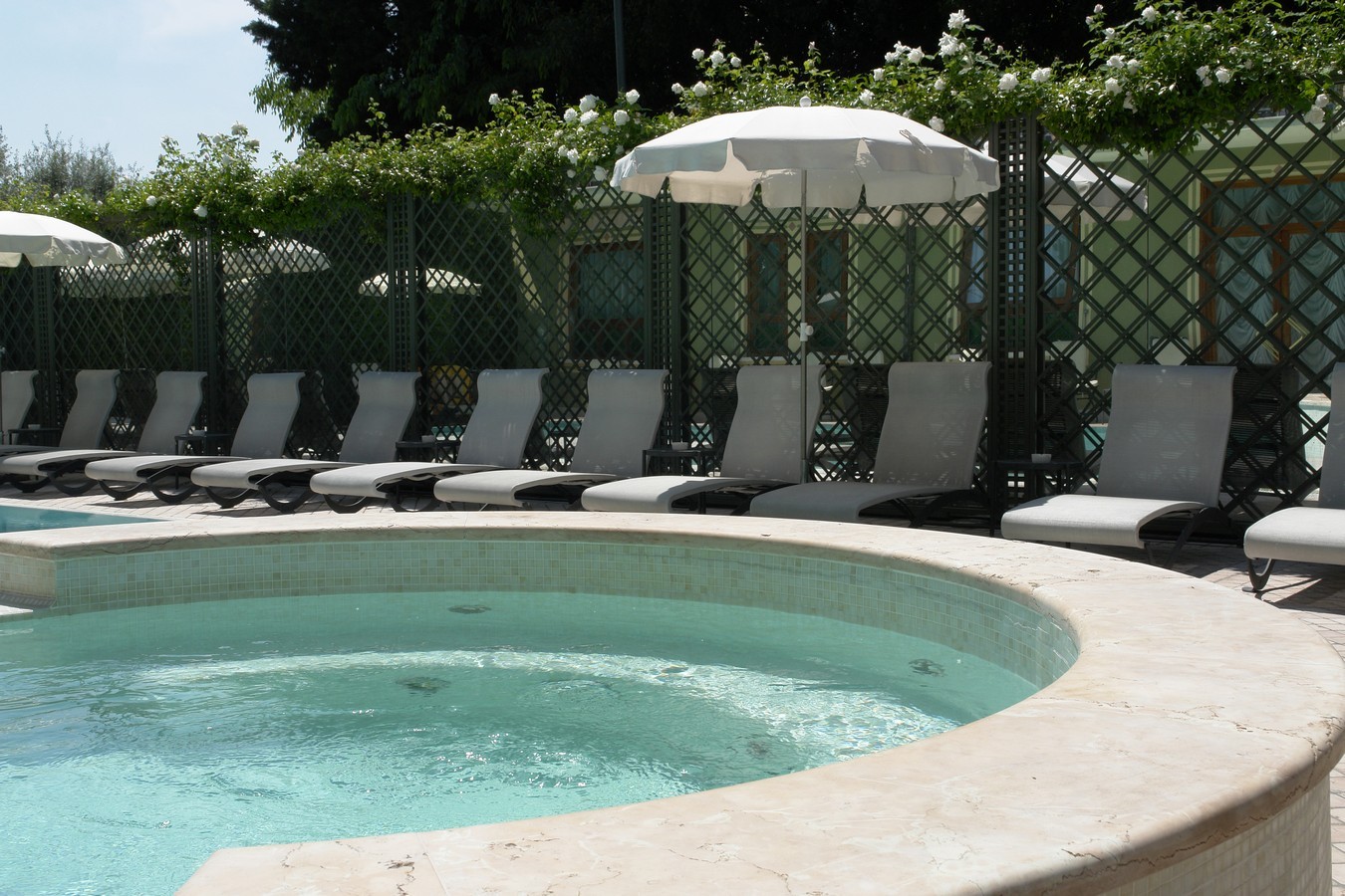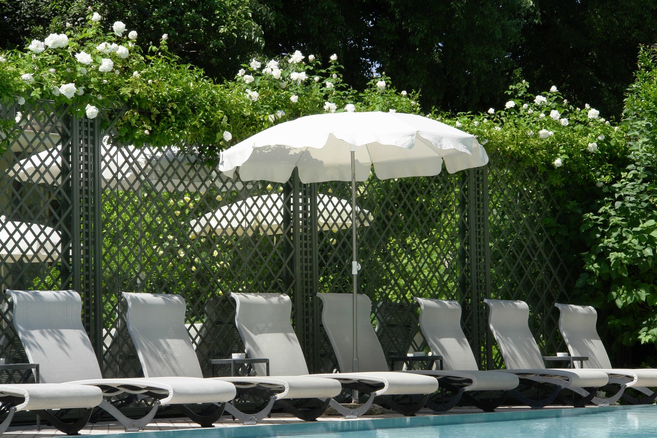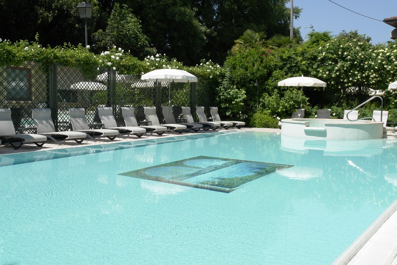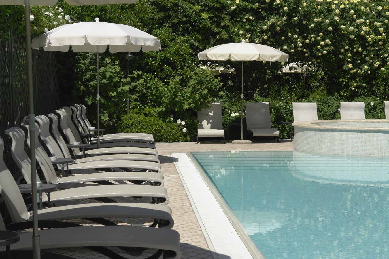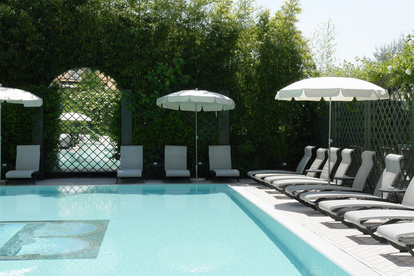 Absolute charm. Green is a truly charming colour for a hotel. This can be seen once again, in the scenery created at the Hotel San Pietro, in Bardolino del Garda, which was photographed this spring in all its splendour. The decorative garden trellises, full of sweet smelling and climbing blossoms, are set in this small paradise that is so charmingly isolated from the noise and view of the nearby street. A large mirror increases the perception of the space and a wonderful archway divides the bar from the relaxing area at the pool, yet still allowing a peek at it.