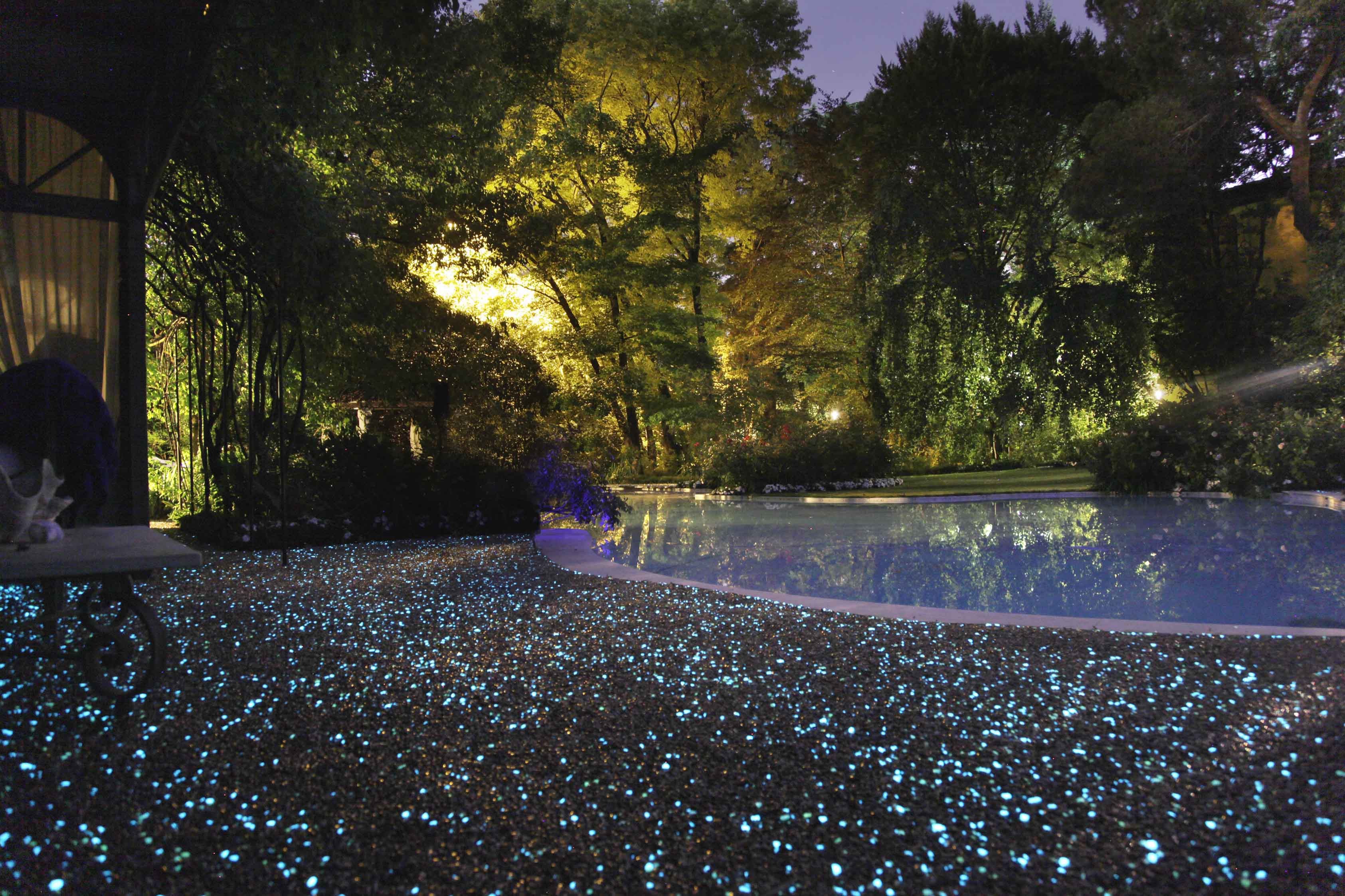Oltre all’illuminazione artificiale, Paghera ha sviluppato diversi materiali e finiture di facile applicazione e bassa manutenzione, come i pavimenti in ghiaia resinata, arricchiti dalla presenza di pietre fluorescenti.